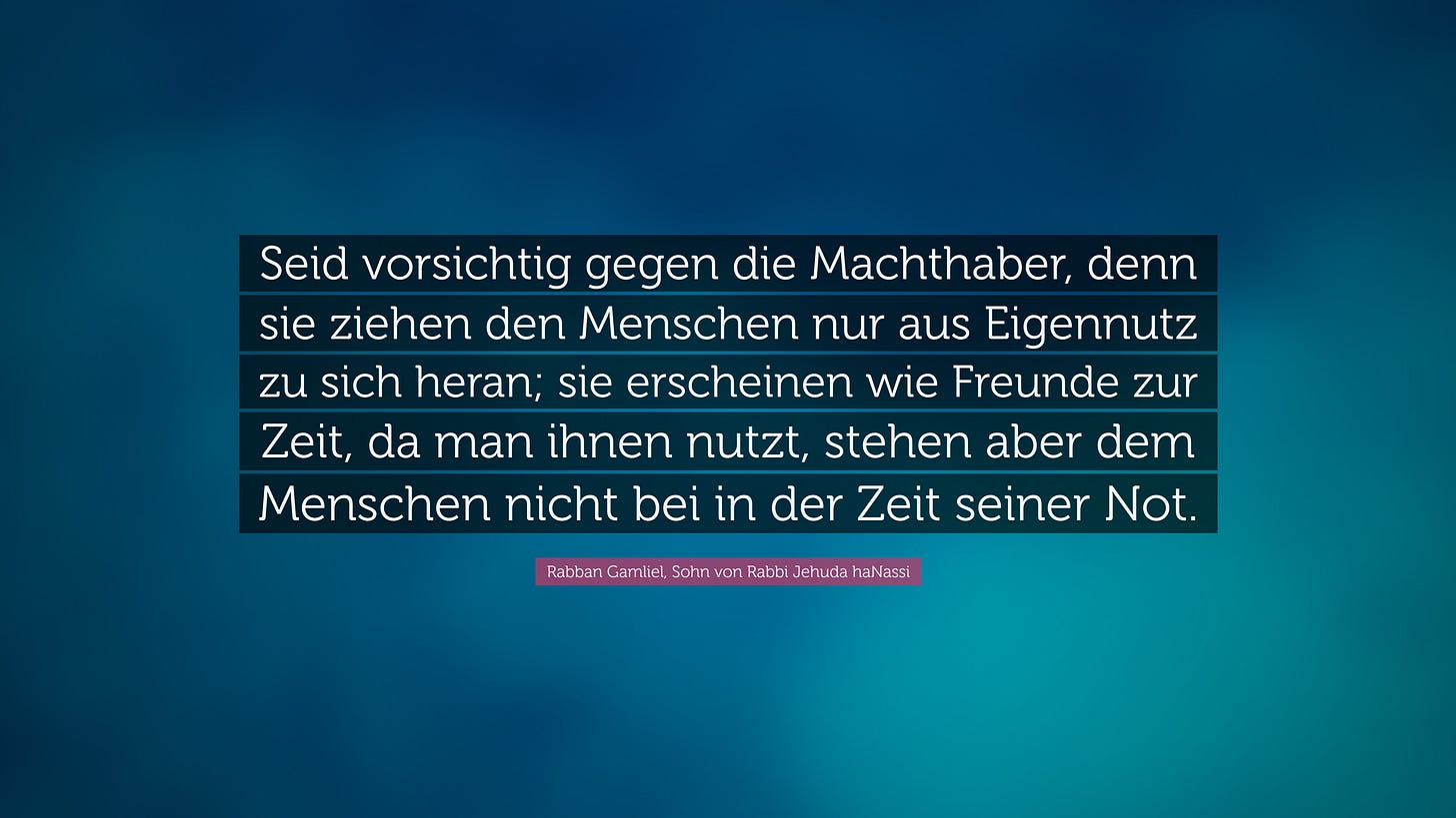 Fast zweitausend Jahre sind vergangen, seit Rabban Gamliel III. im Galiläa des 3. Jahrhunderts lehrte, einer Zeit, in der das Römische Reich von heftigen Umbrüchen gekennzeichnet war. Seine Warnung, dass Machthaber den Menschen nur aus Eigennutz zu sich ziehen, wie Freunde erscheinen, solange man ihnen nützt, aber in der Not nicht beistehen, war eine Lektion in Realpolitik, gelernt im Schatten zerfallender Imperien.